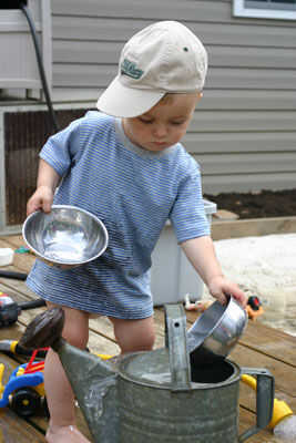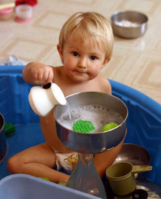 Una nueva variación en este tema que he tratado con éxito es añadir un par de gotas de colorante para grandes contenedores claras de agua. El agua de color añade un nuevo giro al juego y proporciona otra oportunidad para enseñar los nombres de colores. (Como se diluye el colorante no tiene que preocuparse por problemas de tinción, sólo asegúrese de que un bebé no consigue un asimiento de la botellita de tinte concentrado).