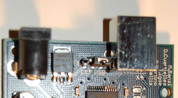Hay 3 pines de energía con un puente sobre dos de ellos. El puente de potencia va sobre los dos últimos alfileres si utiliza alimentación usb (justo como se muestra aquí). Levante el puente y empuje hacia abajo sobre los dos primeros si se conecta 9 voltios de una verruga de la pared.