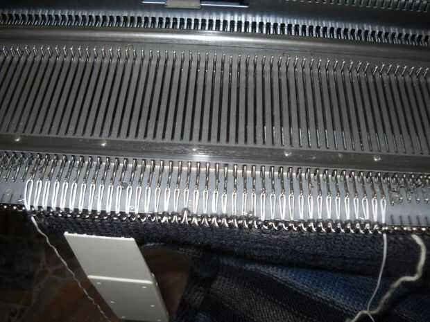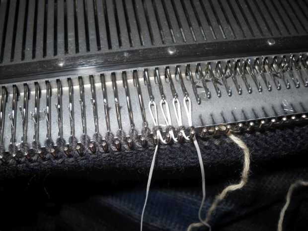 Usando el hilado de nylon (u otro hilado, prefiero el hilado de nylon porque se mueve sin problemas), hacer puntadas a mano, tirando de las agujas tan atrás como sea posible. De esta forma que las puntadas en el hilo de nylon lo no trabajadas. Mantener el hilo de nylon fuera del camino del carro.