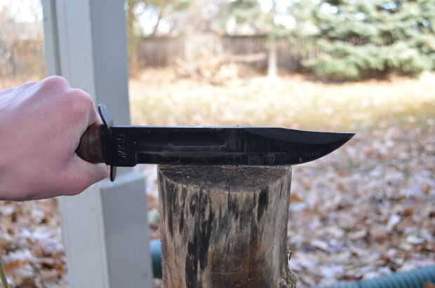 Si puedes, pare la pieza de madera vertical sobre el tocón/plataforma que utiliza. Si no, sostenga la pieza de madera vertical en su mano derecha y presione hacia abajo sobre la madera con la navaja en su mano izquierda, para que no caiga. Luego puede sacar su mano derecha y recuperar tu club.