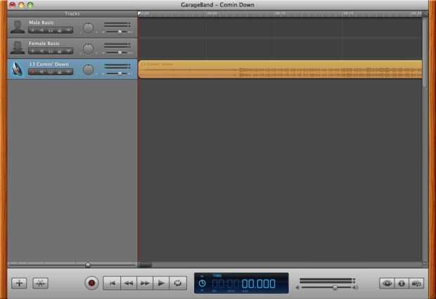 Ahora arrastrar y soltar tus MP3 en el área en blanco debajo de la regla y las pistas vocales. Si la pista no se inicia a las 00:00 en la regla, simplemente haga clic y arrastre para mover la pista a la izquierda. GarageBand ahora debería verse como la primera foto de este paso.