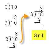 3) multiplica 3 por 3 para obtener 9. Colocar esto debajo de los 10.