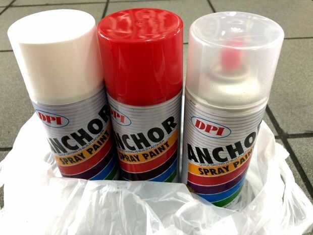 Hay 3 botellas de latas del aerosol que requerí para preparar antes de ir al taller para la pintura de calipers de freno. La pintura de 3 botellas son pintura blanca, pintura roja y laca que cuesta RM18.