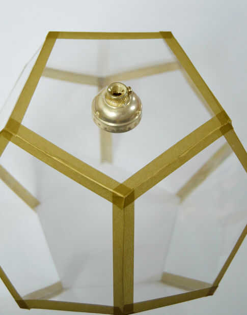 Instale la pieza superior del Pentágono con la base de la lámpara con cinta transparente y cubra con otra capa de cinta washi oro para completar la pantalla. Unos pasos adelante!!!