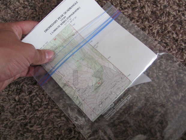 Poner el borde del ziplock entre sus dientes caninos, morder y tire. Si te sientes muy aventurero, un par de tijeras y cortar una pequeña ranura en un lado de la bolsa. El agujero es lo suficientemente pequeño que sale aire, pero a menos que realmente lo use como un juguete de piscina, agua no en. He estado haciendo lo de esta manera durante años y no he arruiné un solo mapa en tiempo inclemente. Si usted está preocupado acerca de la impermeabilización, no cortar el agujero.
