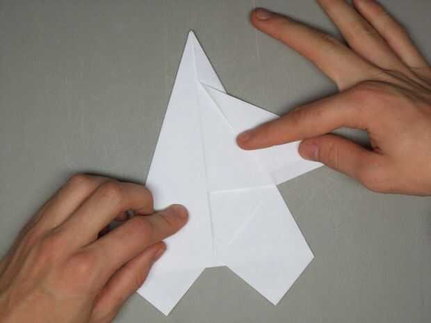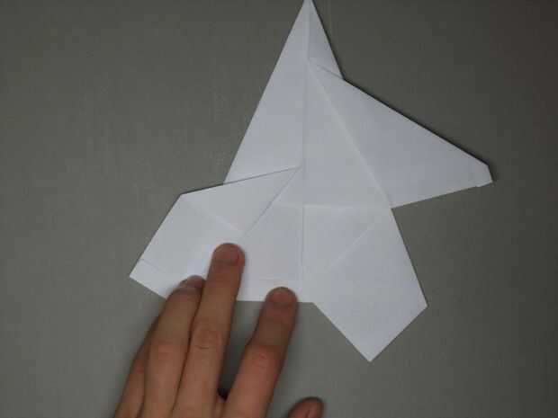 Tomar la ala superior y tire de él hacia fuera tanto como sea posible, al igual que en la imagen. El ángulo en la parte inferior del ala y la parte del avión aproximadamente debe formar un ángulo recto. Luego despliegue la aleta trasera izquierda como se muestra.
