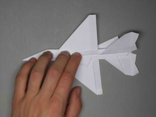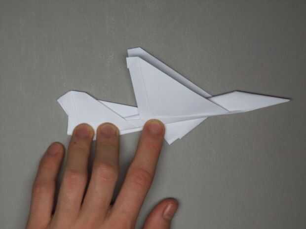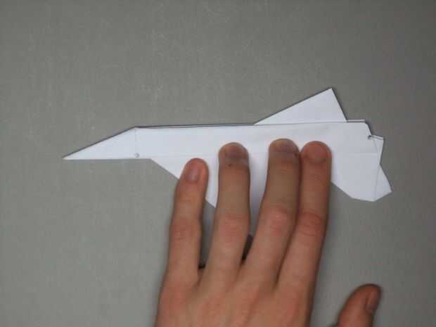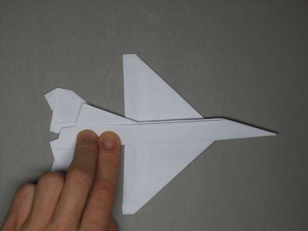 En la primera imagen, dibujé dos marcas de lápiz: uno justo debajo de la zona de cabina y a mitad de camino hasta el extremo posterior del fuselaje. Asir solamente el ala superior y la cola, doblarlas hacia arriba a lo largo de una línea imaginaria entre estos dos puntos. Esto debería ser un pliegue muy fuerte. Dan la vuelta y repetir, asegurándose de que ambos lados se doblan casi idénticamente. Simetría es clave al hacer aviones de papel.