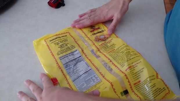 El primer paso es aplanar todo el espacio no utilizado dentro de la bolsa de la merienda, incluso una bolsa fresca de fichas contienen una gran cantidad de espacio vacío. No tiene que ser cuidadosamente aplanado hacia fuera o nada, simplemente Estire los dos bordes o presione sobre una superficie dura como se ve en la imagen de arriba.