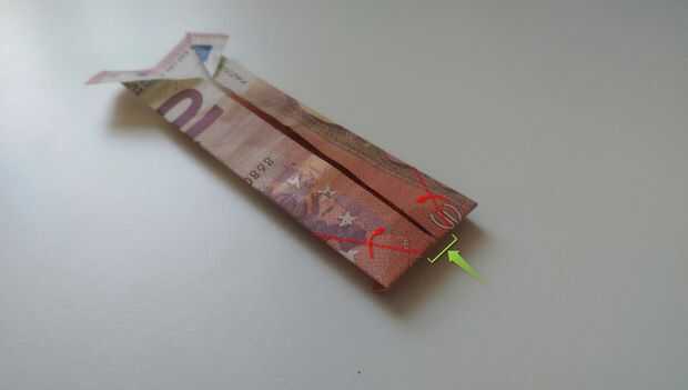 A continuación doblar el anillo real en la parte inferior del billete. Como se puede ver en la fotografía el pliegue no va hacia la línea media. Aproximadamente un tercio del camino desde el borde al centro quedo hacia fuera. En su lugar la punta del triángulo resultante debe apoyarse en la línea media.