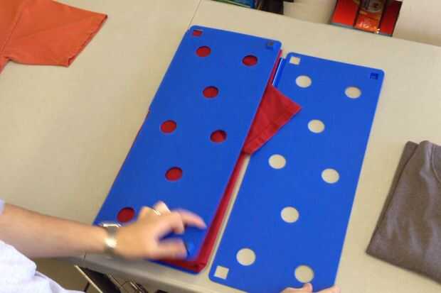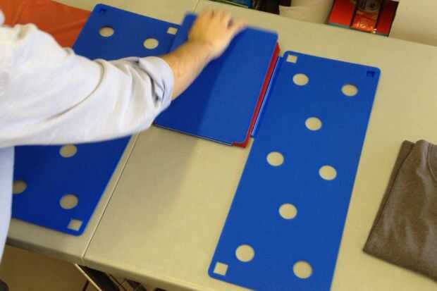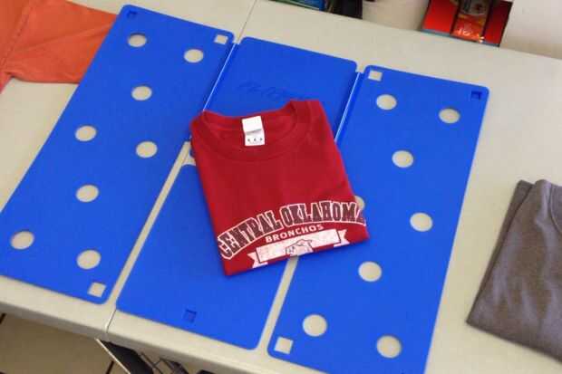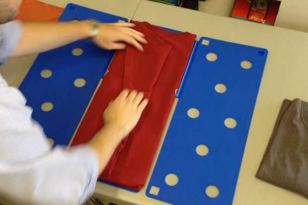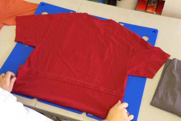 Rápidamente voltea un lado de la mesa plegable, entonces el otro lado. Necesita dar la vuelta rápidamente para mantener la camiseta en el tablero plegable y prevenir deslizamientos y formación de arrugas.