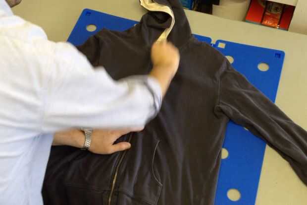 Coloque la camiseta o sudadera con capucha cara abajo, centrado y alineado a la parte superior sobre el tablero plegable. Tenga en cuenta que si hay una capilla, alinee el artículo de la ropa en la parte superior de la Junta donde el cuello sería ser si había uno. Dejar la campana que se extiende más allá de la parte superior del tablero plegable (imagen 3).