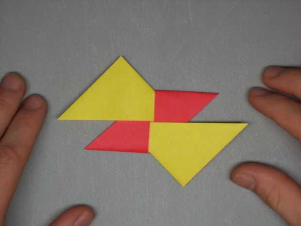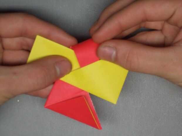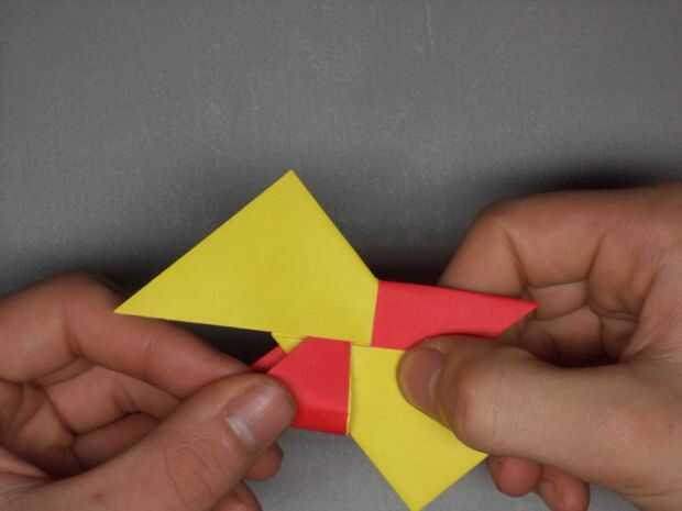 Sujeta las dos mitades como se indica en el paso anterior, tomar uno de los puntos de la pieza inferior y doblar sobre la parte superior de la pieza en la parte superior. Luego meta el punto a la ranura como se muestra en las fotos anteriores. Hacer esto para el otro punto. El resultado debe aparecer como la tercera imagen.