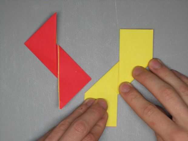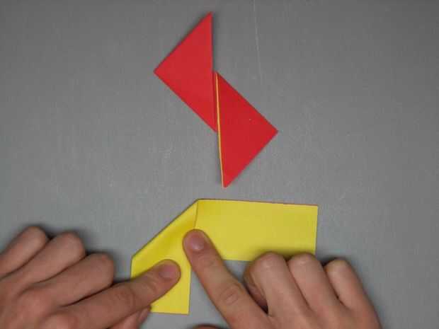 Observe que el lado izquierdo de la primera mitad (la mitad de rojo) se dobla para arriba, mientras que la derecha se dobla hacia abajo. Doblar la mitad nueva (amarilla) para que los lados correspondientes del punto en direcciones opuestas (izquierda abajo, derecha arriba). Esto es muy importante, la estrella ninja no puede realizarse si no son opuestos.