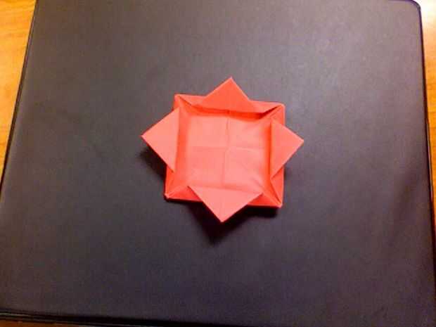 6. Tome cada uno de las cuatro esquinas que usted acaba de traer al centro y doblarlas en la mitad de la espalda al revés para que la punta de cada triángulo está apuntando lejos del centro. Las puntas del triángulo debe podemos ser visto desde el otro lado.