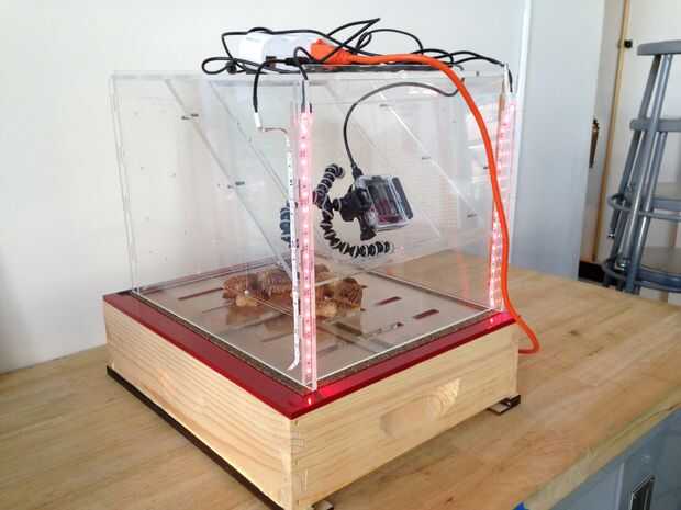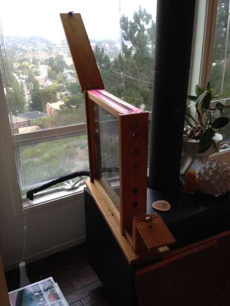 He tomado prestada esta colmena de observación que se muestra en las dos primeras imágenes de un amigo para probar nuevos materiales para la colmena mientras que en residencia de Autodesk. La colmena de observación he mostrado aquí es típico de la mayoría, con los marcos de sostener en posición vertical por lo que se observa una colmena entera y no hay ningún lugar para la reina ocultar. Aunque este diseño es ideal para espectáculos y a corto plazo, no es tan grande para las abejas a largo plazo porque es muy difícil para las abejas a regular la temperatura cuando el peine no agrupado juntas como en una colmena natural. Además, quería una forma de documentar la construcción de la actividad del peine y las abejas, y el acrílico tiene una alta reflectividad y reflejos, lo que hace difícil a la fotografía.