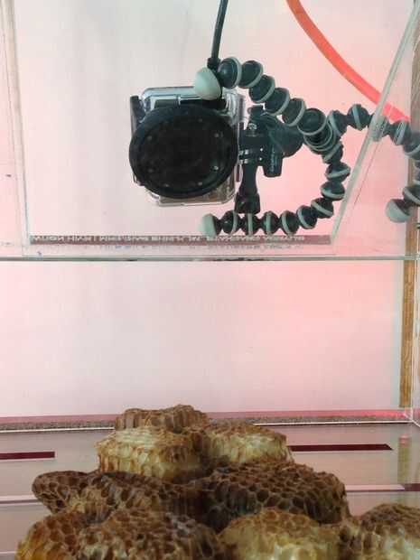 Puedes ver aquí que estoy usando una GoPro con un lente macro para tomar imágenes. I establecer en el lapso de tiempo y está conectado con el cable mini usb. Mi intención original había sido utilizar un escáner de superficie plana hackeado, pero que aún no está funcionando. Verás que tengo rojo tiras de LED para iluminar el interior de la colmena. Las abejas no pueden ver en el espectro rojo, por lo que para ellos la colmena seguirá siendo oscura dentro. Esto permite que la goPro a trabajar. El escáner proporciona su propia luz, así que más adelante que no es necesario el LED. Yo no sé qué las abejas si vieron la luz de espectro completo, pero mi conjetura es se convierten en confundido y puede incluso intentar cubrir la luz con propóleos. Luz pasa a través de propóleos es roja por lo que he visto al quitar las abejas de interior de las paredes.