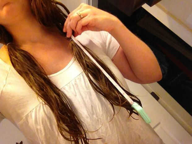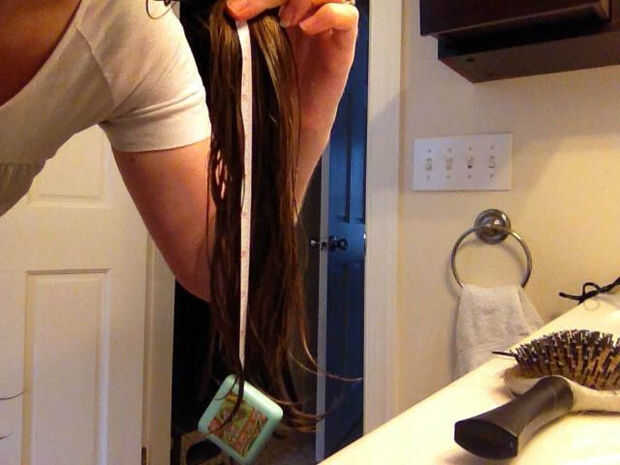 Papá de mi esposo siempre dice, "Medida dos veces, corte una vez," por lo que es lo que hice. Ya que mi pelo estaba en el lado muy largo, me mide 8 pulgadas y se deslizó el mini elástico hacia abajo de la cola de caballo hasta que me mide cerca de 8 pulgadas o un poco más de elástico a los extremos. Así, la donación será por lo menos 8 pulgadas en caso de que necesitan recortar la pieza, además de usted cortará por encima del elástico dando a la pieza un poco más largo también.