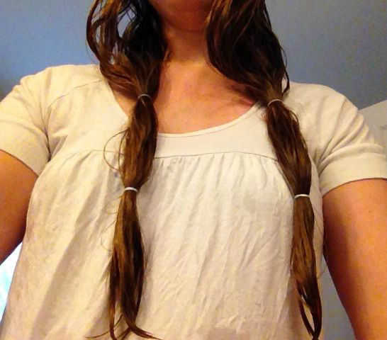 Me gustaría añadir un mini segundo elástico a cada pony para asegurarse de que el pelo quedará juntos después de cortarlo. Lo pongo en algún lugar cerca de la mitad de la donación para que no se caigan y que tiene todo el pelo con seguridad.