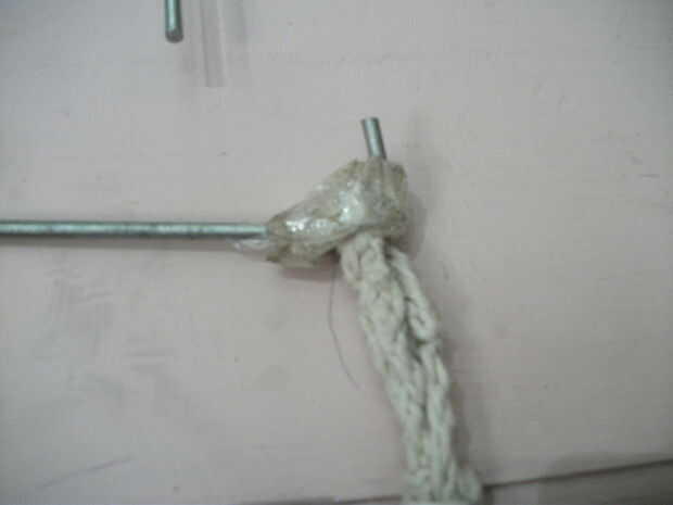Ahora que han hecho cadena de mono con cadena de mono por mono cadena o triple cadena necesita sujetar a su manija. O bien puede usar una clavija de tienda o un palo. ahora en el título decir que fue sin herramientas si usas un palo va a necesitar un cuchillo para tallarlo. Usar una clavija de la tienda en mi látigo. Para fijar la cuerda a la atadura de mango un simple nudo la manija y tire firmemente de la cena. entonces usted necesitará poner cargas y cargas de la cinta sobre el nudo para evitar que resbale.