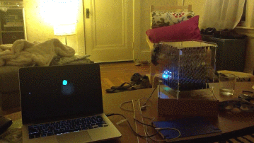 PVector[] topPoints=new PVector[4]; PVector[] bottomPoints=new PVector[4]; topPoints[0]=topLeft; topPoints[1]=new PVector(topLeft.x+side, topLeft.y, topLeft.z); topPoints[2]=new PVector(topLeft.x+side, topLeft.y+side, topLeft.z); topPoints[3]=new PVector(topLeft.x, topLeft.y+side, topLeft.z); PVector bottomLeft=new PVector(topLeft.x, topLeft.y, topLeft.z+side); bottomPoints[0]=bottomLeft; bottomPoints[1]=new PVector(bottomLeft.x+side, bottomLeft.y, bottomLeft.z); bottomPoints[2]=new PVector(bottomLeft.x+side, bottomLeft.y+side, bottomLeft.z); bottomPoints[3]=new PVector(bottomLeft.x, bottomLeft.y+side, bottomLeft.z); //draw the twelve edges of the cube for (int i=0; i<4; i++) { drawLine(topPoints[i], bottomPoints[i], col); drawLine(topPoints[i], topPoints[(i+1)%4], col); drawLine(bottomPoints[i], bottomPoints[(i+1)%4], col); } //now draw the vertices. I think that it looks nice to make these in a different color than the edges. for (int i=0; i<4; i++) { cube.setVoxel(topPoints[i], color(255,0,0)); cube.setVoxel(bottomPoints[i], color(255,0,0)); } La función completa y el código de trabajo son en el ejemplo de los cubos en la biblioteca de procesamiento.