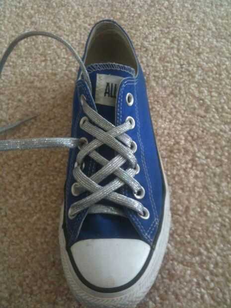De hilo otra vez ambos cordones hasta los 4 ojales y tire hacia afuera.