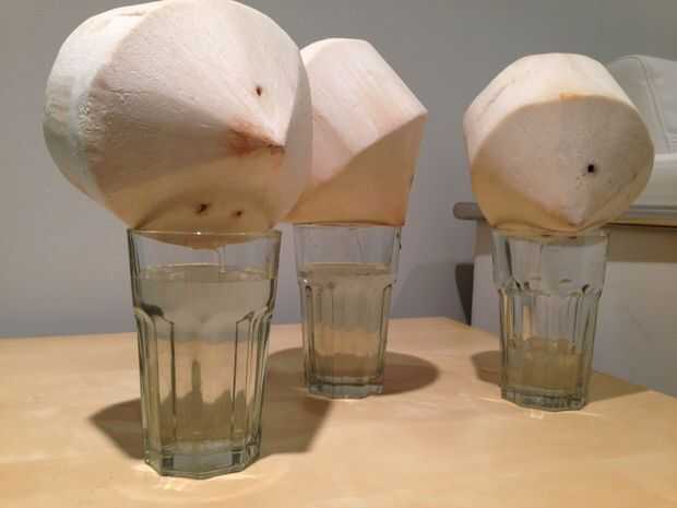 Ahora coloque los cocos arriba las copas a drenar con los dos agujeros que se coloca sobre la taza. Las tazas que elegí eran en realidad un poco demasiado pequeñas y desbordaban un poco, así que uso las tazas más grandes que tienes. Los cocos se dren rápidamente!