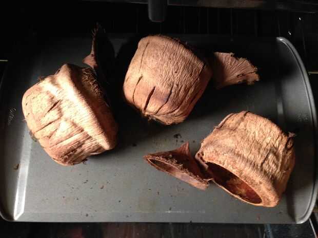 Hornee los cocos en una hornear a 300 grados durante 5 horas. Si la cáscara todavía se siente blandita y se ve blanco, hornear más hora y media a 350 grados. Monitor con frecuencia durante la última hora.