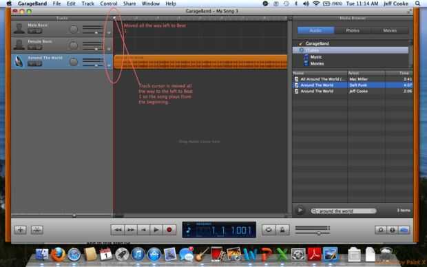 Para mover una pista a un específico tiempo/ritmo, haga clic en cualquier lugar en la pista de la canción otro entonces la izquierda (verá que sería ampliar la pista en lugar de moverlo) y mover/arrastrar a la izquierda por lo que la canción comenzaría en el pulso 1. Usted verá los golpes (1, 2, 3) en la parte superior de la pantalla.
