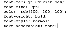 Esta propiedad especifica cuán grande será el texto. Puede utilizar una variedad de maneras para establecer este valor, pero encuentro ajuste usando el tamaño para ser más fácil. Creo el tamaño predeterminado es 9pt, así mantener todo igual que antes, puede usar font-size: 9pt;. Alternativamente, usted puede elegir no agregar esta propiedad.