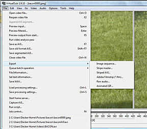 Para dividir el vídeo en fotogramas, seleccione "exportar" y luego "secuencia de imágenes" en el menú desplegable de archivo. El nombre que le da el primer archivo se dará a todos los archivos con la extensión número secuencial.