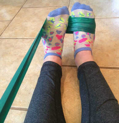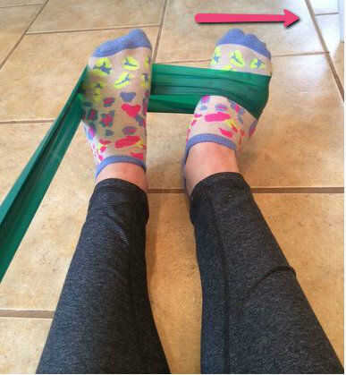 El tercer ejercicio consiste en colocar la banda de resistencia alrededor de la bola del pie con los dedos de los pies hacia arriba. Para crear la tensión adecuada, la banda también debe ir en pie no ejercer con ese pie tirando de los pies ejercicio. Luego, presione el pie contra la banda hacia el exterior. Este ejercicio trabaja los músculos en los lados exteriores del tobillo. Completar 3 series de 10 repeticiones.