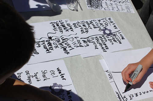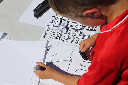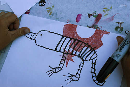 - "Aquí es lo que vas a hacer: vas a tomar una cosa de la lista de la tierra y una cosa de la lista del agua y vas a majarlos juntos en una nueva criatura y vas a dibujar lo que parece."