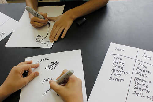 - "Usted tendrá 2 minutos para hacer 2 listas. Lista #1: como muchas criaturas como usted puede pensar viven en la tierra. ¿Quién me puede dar un ejemplo? [Tomar ejemplos de la multitud]. Gran. Lista #2: criaturas como muchos como usted puede pensar viven bajo el agua. ¿Cuáles son algunos ejemplos? [Tomar ejemplos de la multitud]. ¡ Excelente! Así que usted consigue la idea. Bueno, tienes 2 minutos - ir! "
