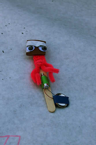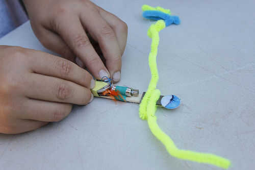 - "Por suerte, tenemos un buen rato materiales aquí — algunos clips de papel y láminas de espuma y pom poms, que con tu imaginación pondrá todas estas otras partes del cuerpo de tu robot!"