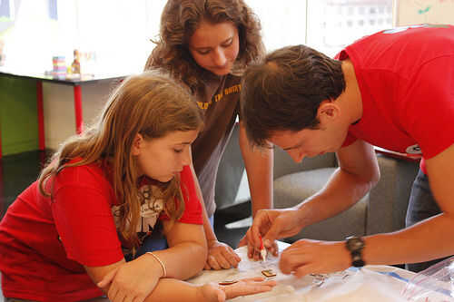 Cada estudiante recibe su insignia de goma y una base de madera y se alinea frente a un facilitador (que es usar guantes de nitrilo, si ella no quiere unir sus dedos). Asegurándose de que pegue en la orientación de la imagen del espejo, el estudiante pone la base de madera, facilitador pone gota de Pegamento líquido y facilitador pone pedazo de logo de goma en la parte superior. Estudiante tiene mano, facilitador pone la base + goma, instruye a estudiantes para mantenerlo así durante un minuto o dos mientras está secando.