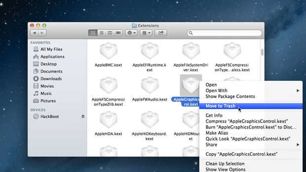 Paso 2: En esta carpeta, busque el archivo "AppleGraphicsControl.kext" (sin las comillas) y eliminarlo. Esto permitirá que tu máquina virtual arrancar sin la ISO HackBoot. Ver la imagen del paso numero dos (imagen principal).