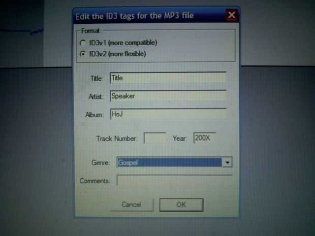 Rellene la información otra vez. Título = Título, artista = altavoz, álbum = HoJ, sin número de pista, año = este año, genero = Evangelio