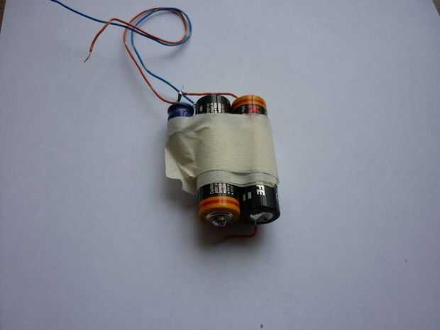 Las uniones de las baterías deben ser suavemente desgastadas para ayudar en el proceso de soldado. Las dos baterías son pegadas con cinta adhesiva, la conexión positiva de una al lado de la conexión negativa de la otra y el condensador electrolítico de 470uF luego pegar con cinta adhesiva hacia el final de la Asamblea como se muestra en la segunda foto de arriba.