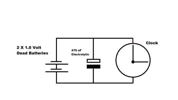La conexión negativa de una batería se conecta a la conexión positiva de la otra en el extremo inferior de la Asamblea usando soldadura tubular y una longitud corta de gancho encima del alambre como se muestra en la segunda foto de arriba. Por este medio las baterías ya han sido conectadas en serie. En el otro extremo de la Asamblea el condensador electrolítico se conecta a través de las conexiones positivas y negativas y dos longitudes de gancho encima del alambre están conectados, uno para cada conexión del condensador electrolítico. Éstos forman el alimentación al reloj para corta las tiras por consiguiente. Consulte el diagrama de circuito muy simple arriba. Asegúrese de observar la polaridad al conectar el condensador electrolítico.