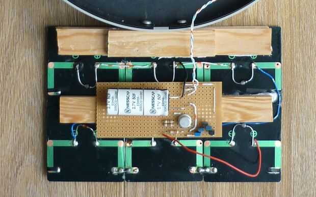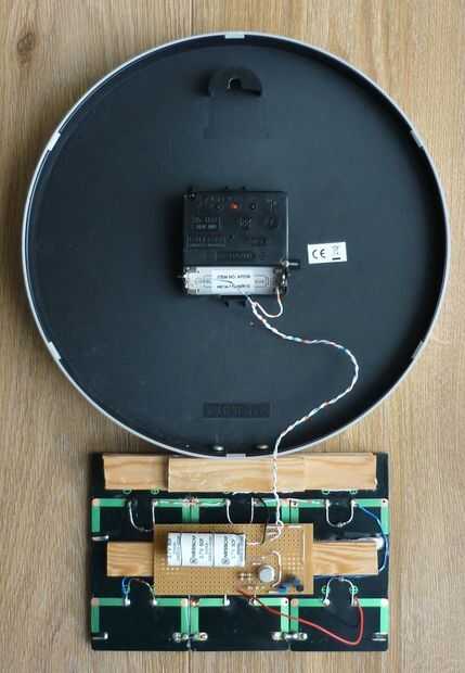 La tercera foto muestra la construcción en la parte trasera del reloj que, en este caso, presenta cierta dificultad en que hay poco espacio para la electrónica. El circuito está montado en Veroboard pegado a la parte posterior de la matriz de célula solar que a su vez se une al reloj con los tornillos después de la perforación--todo depende del reloj y se necesita flexibilidad.