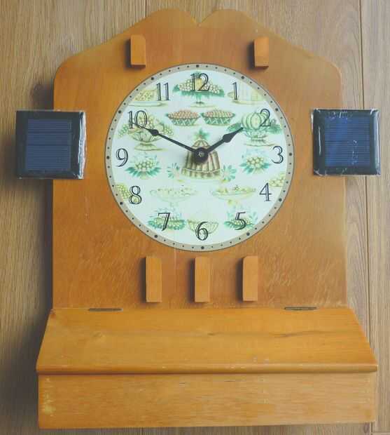 Las células solares tienen que ser en la cara del reloj para recoger la luz. Cómo pegue las células depende del reloj. Opté por colocar las dos células mediante adhesivo de polímero MS en una configuración simétrica como se muestra en la imagen como un par de oídos y esto guardar el reloj para pasar los cables a través de la perforación.