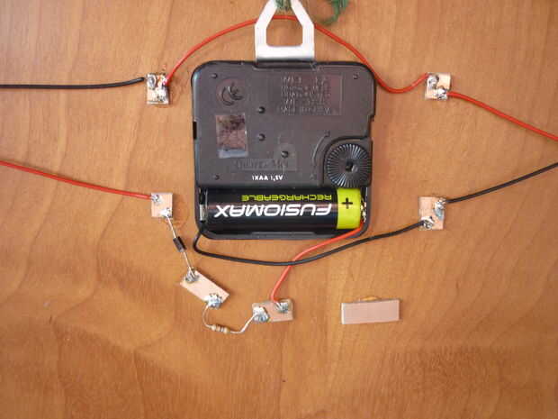 Simplemente siga el diagrama del circuito. El cuadro que se muestra el circuito terminado con una célula de hidruro de níquel metal instalada. La resistencia es de 470 ohmios. Intente soldar rápidamente y eficientemente--calor prolongado puede dañar el pegamento debajo de las almohadillas.
