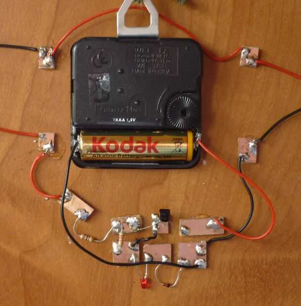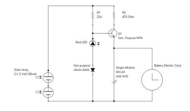 La célula alcalina se coloca ahora en el circuito de emisor de un transistor NPN de propósito general, utilicé un 2N3904. El circuito de base consiste en un resistor k 22 alimentación luz roja emisión de diodo (LED) y un diodo de silicio de uso general en serie. Esto pone una tensión de unos 2,05 voltios en la base del transistor que resulta en alrededor de 1,45 Volts en el emisor y a través de la célula del AA. La célula es simplemente se mantienen en su voltaje de trabajo normal con el reloj teniendo muy poca energía de la batería y el circuito solar que alimentan muy poco, allí no participa ningún elemento de flotación de carga.