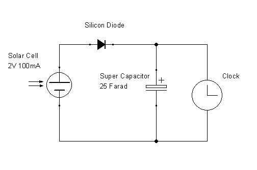 La célula solar carga el condensador estupendo a través de un diodo. El reloj está conectado a través del condensador estupendo.