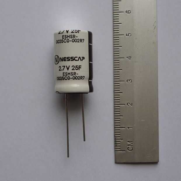 El condensador estupendo en la ilustración tiene una capacidad de 25 faradio y se obtuvo aquí en el Reino Unido desde mi tienda Maplin para unos £3, (4 Euros o 5 dólares). Sé por experiencia que cuando cargo a 2 voltios este condensador puede ejecutar nuestro reloj de alrededor de 48 horas. Queremos como gran capacidad como costo permite para llevar la unidad a través de días aburridos pero el componente físico debe caber en el espacio disponible en la parte trasera del reloj y una unidad de 50 faradio puede tener un diámetro demasiado grande. Que tenga que recurrir a dos unidades más pequeñas en paralelo. Como todos los condensadores electrolíticos deben observar polaridad así que verifique y compruebe otra vez que tienes la forma correcta de ronda!