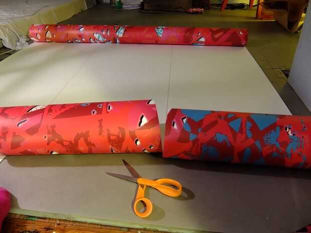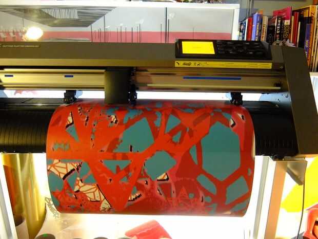 El vinilo impreso era tan amplia como la puertas de mi estudio, por lo que el primer paso fue cuidadosamente corte al tamaño antes de enviarlos a través del cortador del vinilo a cortar con patrón.