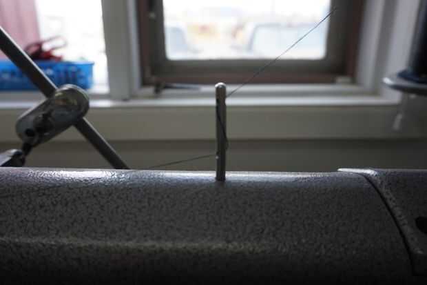 Desde aquí, tomar el hilo a la primera guía del hilo en la máquina. Es un pequeño post en el centro que tiene dos agujeros en él (Foto 2).
