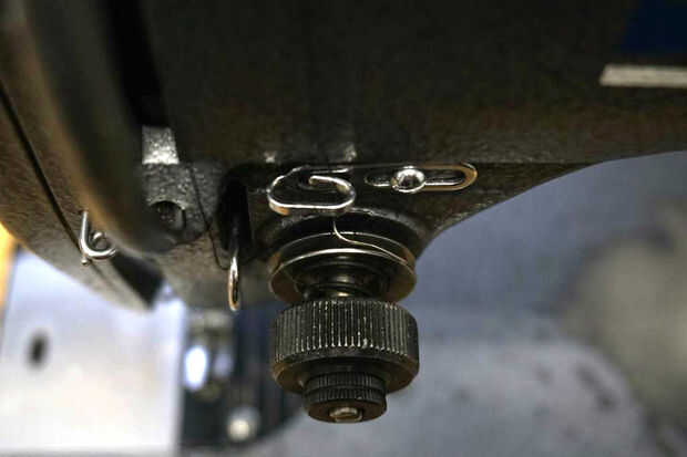 Ahora mueva la guía de tensión, el botón se muestra en la foto 1 situado justo debajo de la tercera guía sobre la cabeza de la máquina.