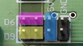 En el primer plano, muestra cómo están dispuestas las clavijas. Hay dos pernos encabezado cada D6, D9, 5V y GND. Esto hace fácil conectar dos motores DC o dos servomotores utilizando estos 8 pines. Del mismo modo, existe otro grupo de 8 pernos para D3, D10, 5V y GND controlar otro DC dos servo motores.