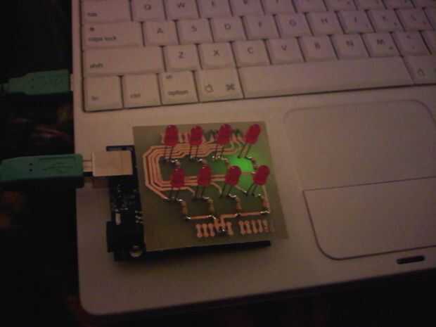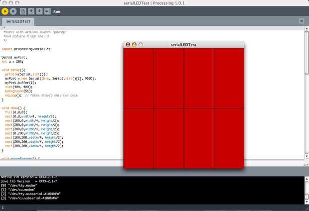 A continuación abra el bosquejo de procesamiento y haga clic en el botón play. Una ventana se abrirá con su programa que se ejecuta en él. Haciendo clic en cada uno de los rectángulos rojo se iluminará el LED correspondiente en el arduino durante aproximadamente un segundo